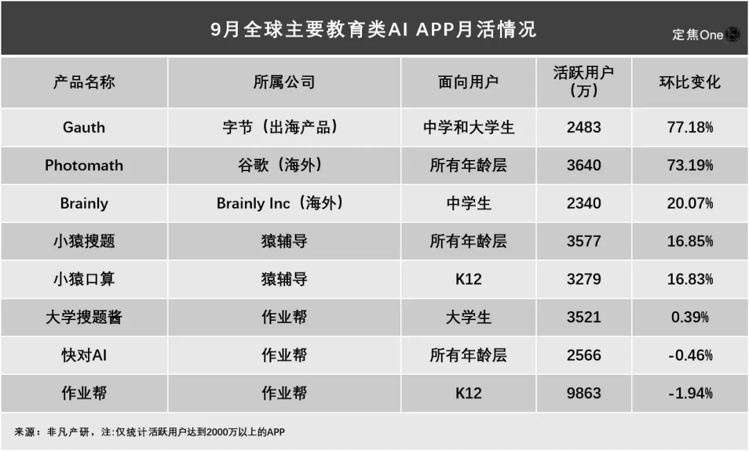 互联网大厂、教育大厂以及创业公司都想做教育类 AI 使用,注册用户数环比增加 50%。从打摄影答疑、AI功课批改、单词等根本东西,