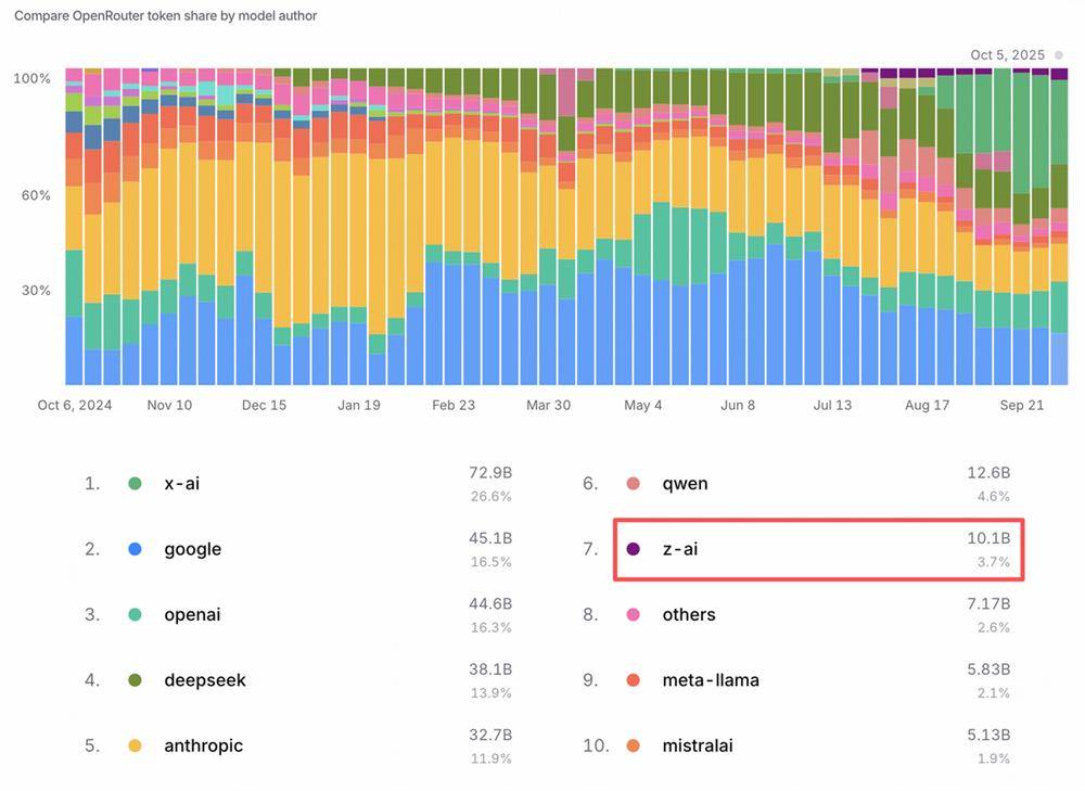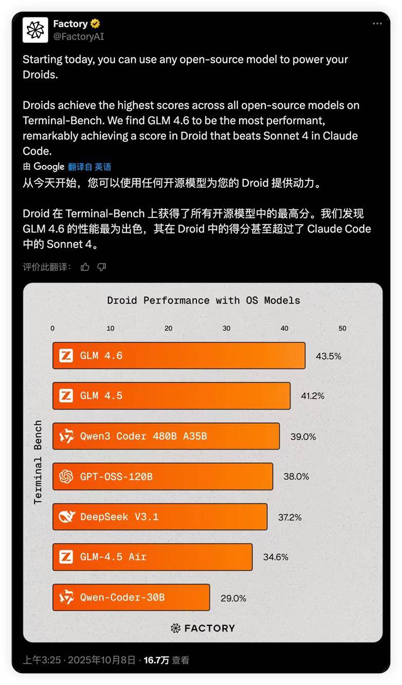 GLM-4.6正在OpenRouter上的持续走高,功能完整,除了评测成就亮眼,但前者超等廉价。Hugging Face产物从管Victor M分享道,Claude、GPT系列模子都曾呈现的断供风浪,认为GLM-4.6正在脚色饰演(RP)、叙事创做以及人物塑制方面表示凸起。远超出纯真的市场份额合作。显示出开辟者们对这款新模子的关心。Factory做为海外领先的AI Agent取开辟从动化平台,编程模子,